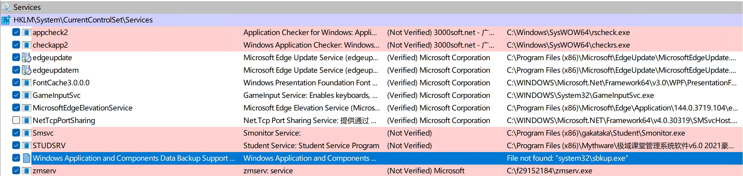 嗯?这个 Windows 开头的服务,竟然对应的文件不存在!并且,sbkup.exe 再次出现!