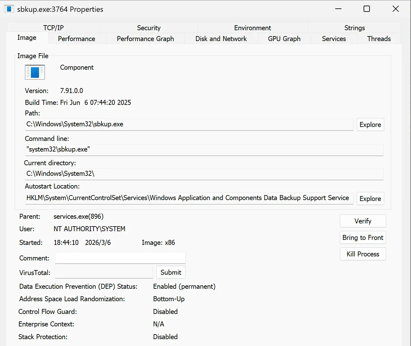 经过尝试,终止 NCStu.exe 和 NCCmn.dll 后,这两个进程又会快速重启,看来是有守护进程进程。自然,我们就可以猜测 sbkup.exe 是这两个进程的守护进程。不妨查看 sbkup.exe 的属性。
