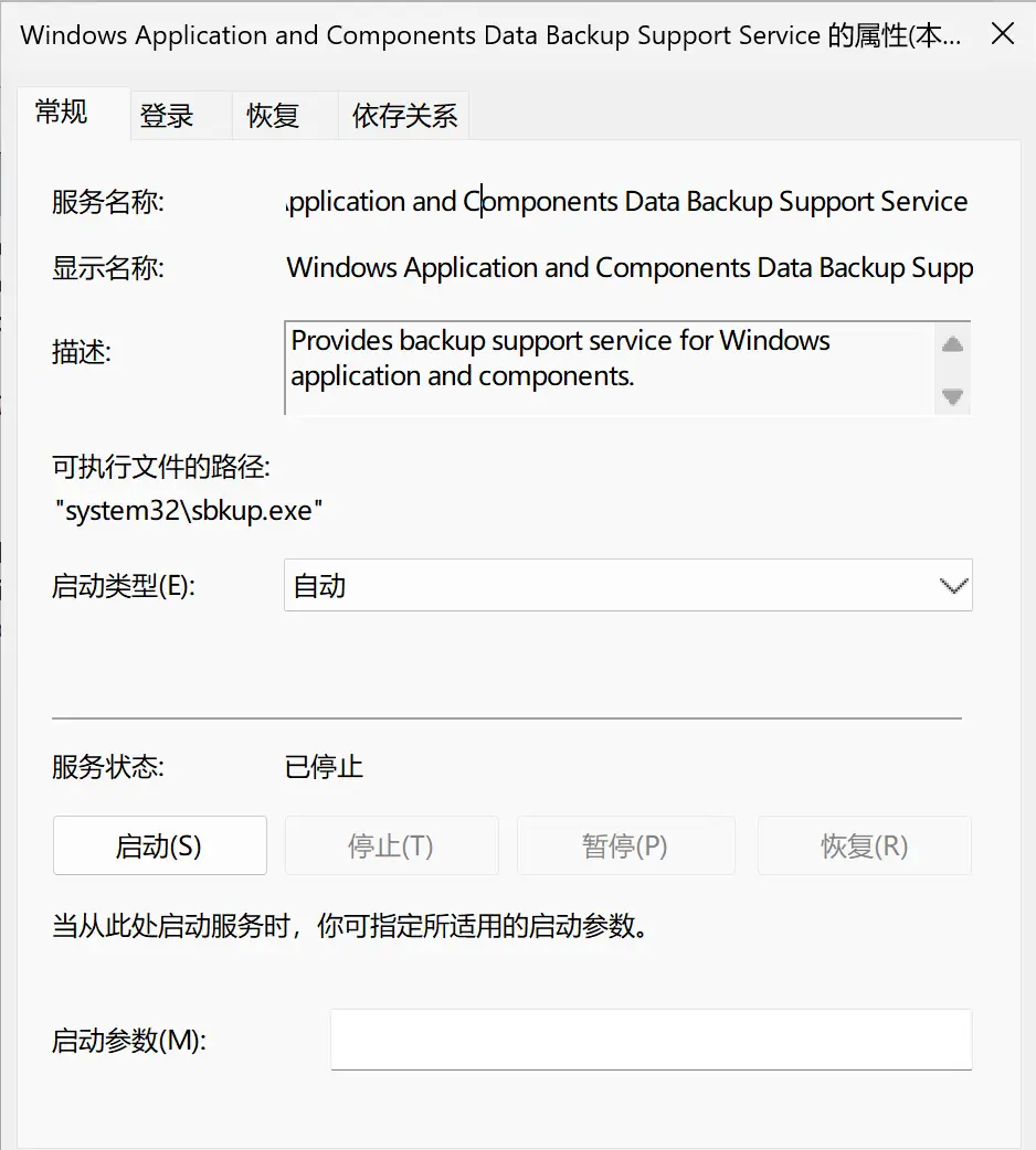 服务描述翻译过来是:为 Windows 应用程序与组件提供备份支持服务。